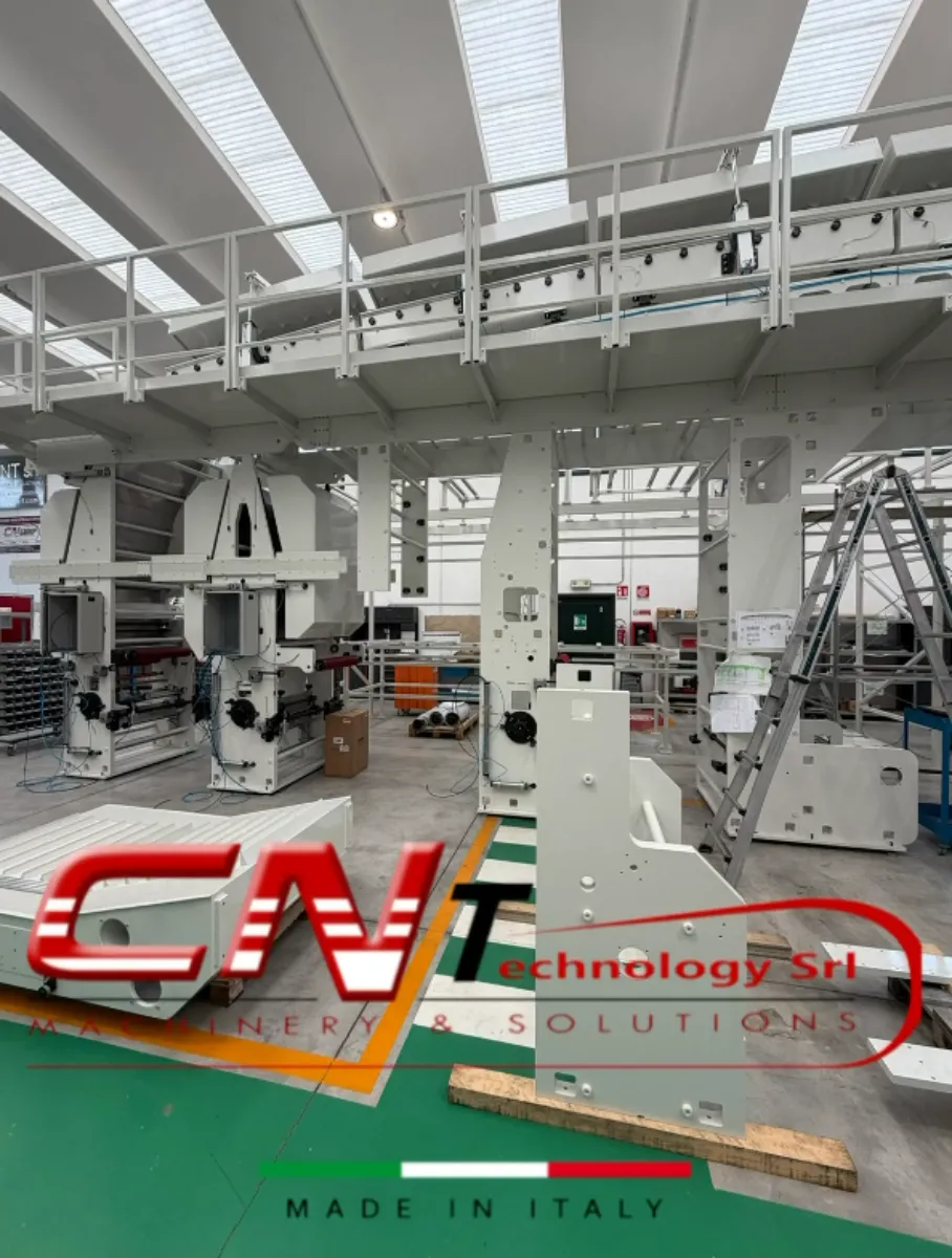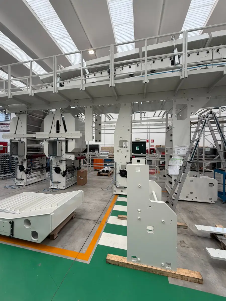 L'immagine rappresenta una Spalmatrice rotocalco con 3 gruppi di spalmatura e un ponte di asciugatura studiato su misura per il cliente.